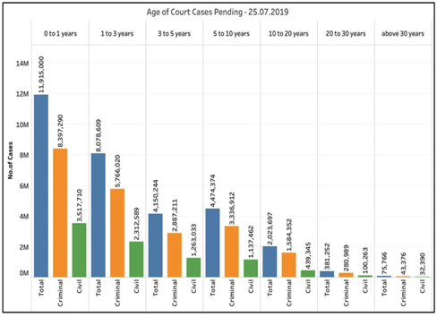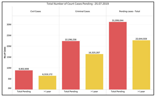 An estimate of 31 million cases pending in various courts across India. The National Judicial Data Grid estimates that more than three crore cases pending across courts, with approximately 65 lakh cases pending for over five years. It has been estimated that 12 million Indians await trial in criminal cases throughout the country. On average, it takes twenty years for a real estate or land dispute to be resolved. A 2009 law commission report said it would take 464 years to clear pending cases.